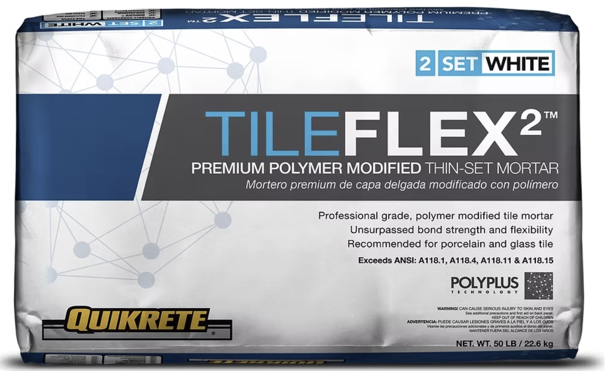 Mortero de grado profesional, de capa delgada, modificado con polímeros para instalaciones comerciales y residenciales de losa y piedra natural. TILEFLEX 2™ provee excelente adhesión para instalaciones sobre superficies difíciles como madera, pisos de vinilo o sobre losas existentes. Su alto contenido de polímeros adhiere porcelanato, azulejos de vidrio, cerámica y otros materiales de poca absorción en pisos y en pared.
