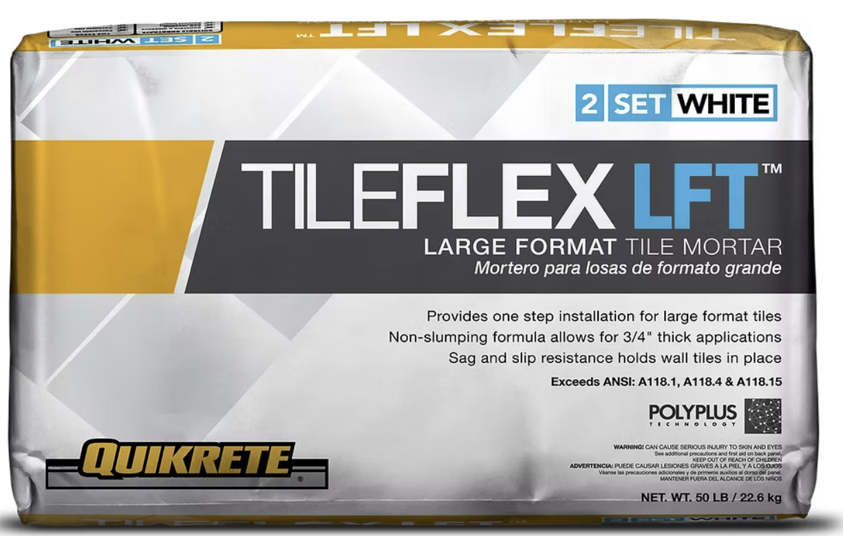 Mortero modificado con polímeros que puede aplicarse en capa delagada o mediana para la instalación de losas de formato grande, entiéndase mayor de 15” x 15”(38.1 x 38.1 cm) . Su fórmula antideslizante elimina problemas de desnivel produciendo pisos planos y parejos. TileFlex LFT™ tiene un alto contenido de polímero único que permite la instalación de losas de formato grande en superficies verticales.